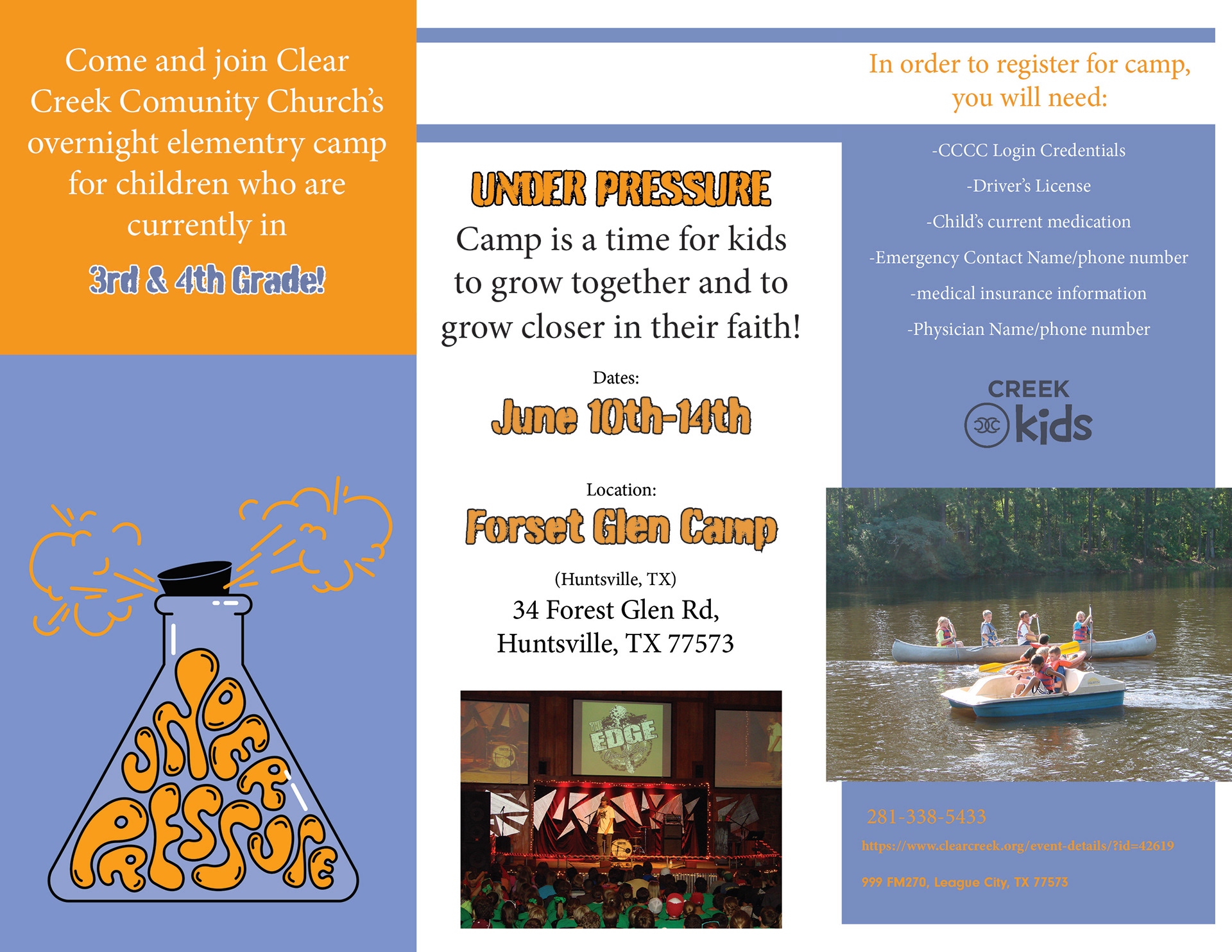 I wanted to extend my broadcast of my non-profit organization's camp to a tri-fold brochure. Clear Creek Community Church offers three summer camps for students: High School, Junior High, and Elementary. The tri-fold highlights the elementary camp for kids entering the 4th and 5th grades in the 2023-2024 school year. The camp's theme is "Under Pressure," and mark your calendars since it occurs the second weekend in June at Forest Glen Camp in Huntsville, TX. The church is a non-profitable organization that hosts three separate camps every year, and while parents pay to register their children, the money goes towards the camp expenses. These expenses include fun events, food, and lodging. The kids partake in outdoor activities, fun games, worship time, and bonding with new and current friends. I attended this camp as a child and looked forward to it every year. I wanted to share more information than what was in the original ad. This brochure allowed me to add the location, dates, contact information, requirements, and fun images. Unfortunately, the camp is so popular, it is already sold old, but do not despair. Sign up for the wait list now! It is a first come and first serve, and you will not want your child to miss out!
